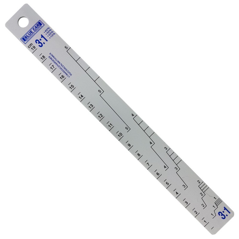 Aluminiowa listwa lakiernicza do mieszania z podziałką umożliwiającą odmierzenie odpowiedniej ilości utwardzacza i rozcieńczalnika wg proporcji (2:1 oraz 3:1).